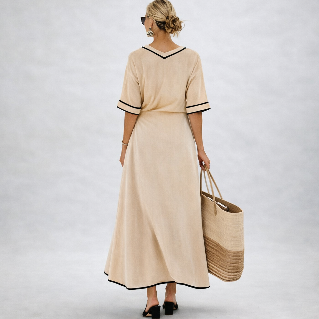 Lehký, měkký materiál jemně splývá kolem těla a vytváří uvolněnou, ženskou siluetu, ve které se budete cítit pohodlně po celý den. Výstřih do V dodává šatům jemnou eleganci, zatímco kontrastní detaily přinášejí moderní a svěží vzhled.